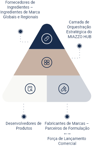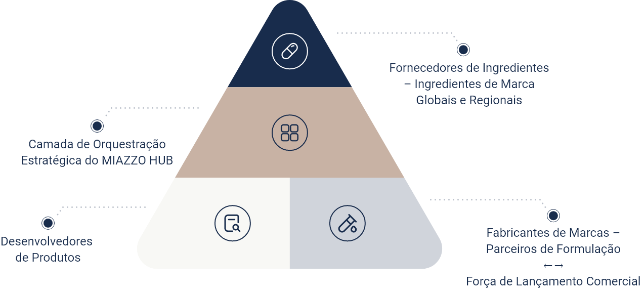 Miazzo HUB é a plataforma estratégica que conecta fornecedores de ingredientes premium, desenvolvedores de produtos (CDMO’s) e fabricantes de marcas no mercado nutracêutico que mais cresce no Brasil. Um ecossistema. Três agentes. Oportunidades infinitas.